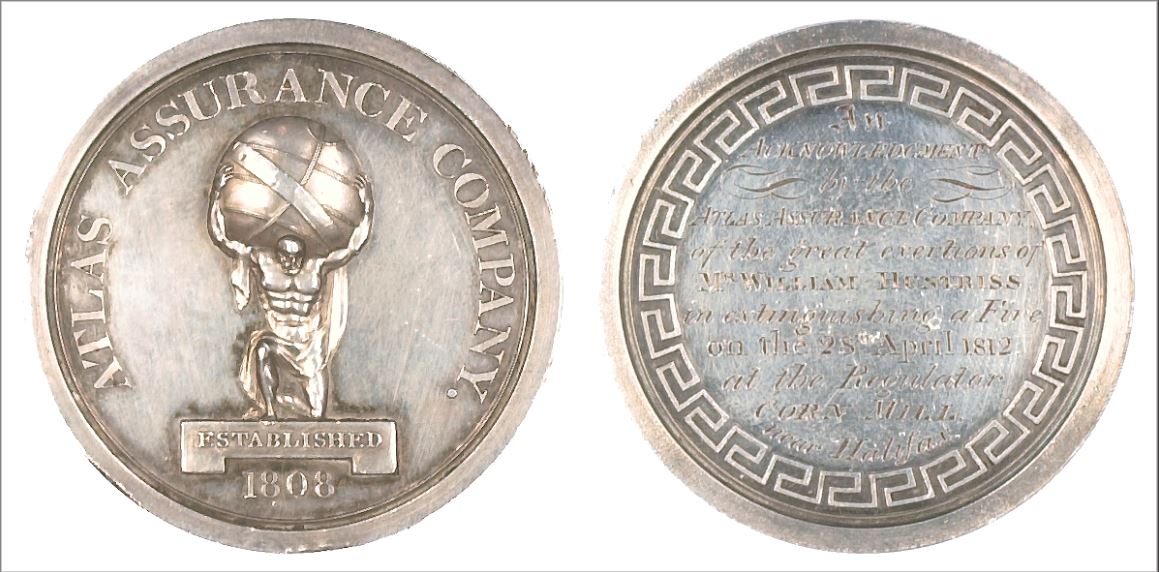 The next item appeared in an auction catalogue in 2003. It is described as an "Atlas Assurance Company Medal, 46mm., silver medallion, obverse: the titan Atlas supporting the World; reverse inscribed, ‘An Acknowledgment (sic) by the Atlas Assurance Company of the great exertions of Mr William Huntriss in extinguishing a Fire on the 28th April 1812 at the Regulator Corn Mill near Halifax’, in case of issue, edge bruising, good very fine and very rare £300-400".