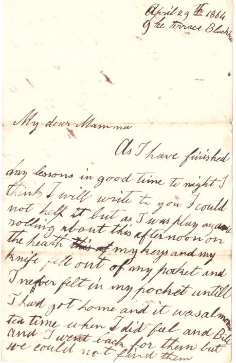 I could not help it but as I was playing rolling about this afternoon on the heath my keys and my knife fell out of my pocket and I never felt in my poacket until I had got hoe and it was almost teatime when I did feel and Bill and I went back for them but we could not find them.