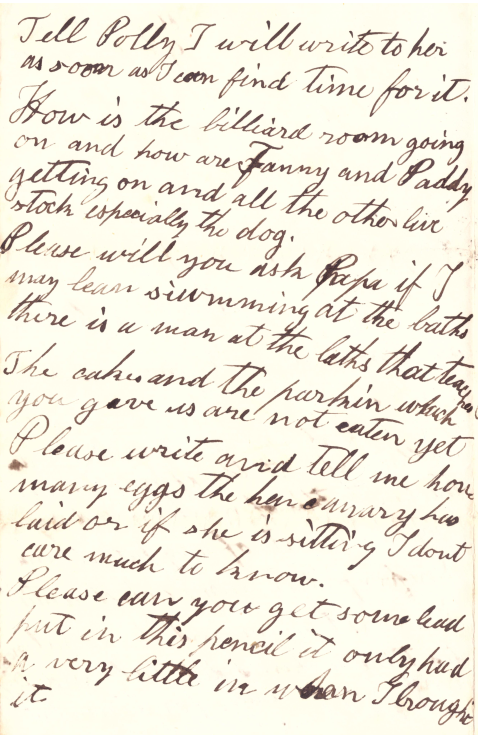 Tell Polly I will write to her as soon as I find time for it. How is the billiard room going on and how are Fanny and Polly and all the other livestock especially the dog.