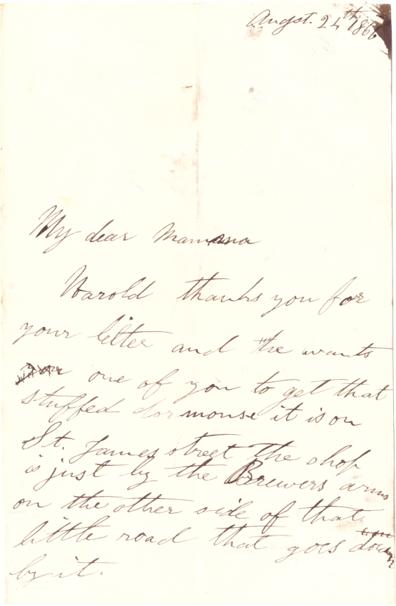 Harold thanks you for your letter and he wants one of you to get that stuffed dormouse it is on St James Street the shop is just by the Brewers Arms on the other side of that little road that goes down by it.