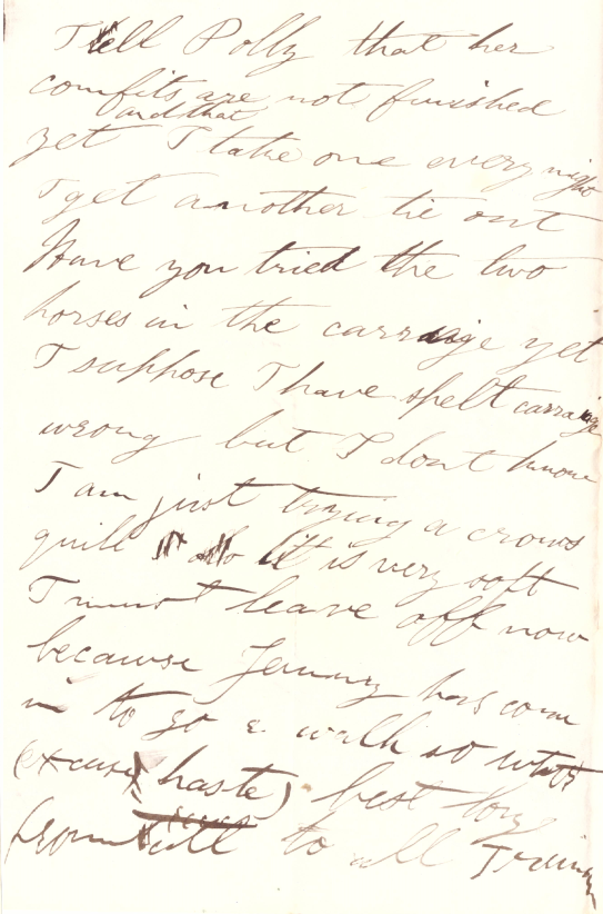 Tell Polly that the comfits are not finished and that I take one every night. I got another tie out.