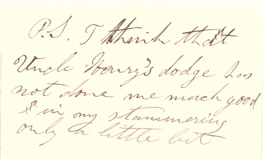 PS I think that Uncle Henryls dodge has not done me much good in my stammering only a little bit