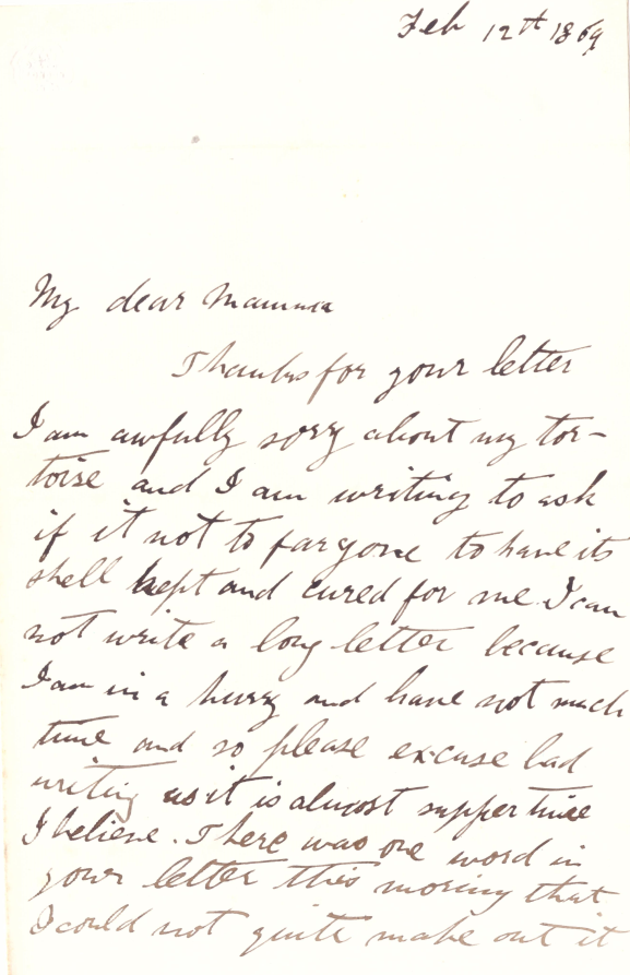 Thank you for your letter. I am awfully sorry about my tortoise and I am writing to ask if it is not to far gone to have its shell kept and cured for me.