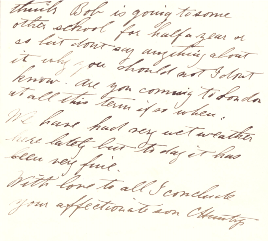 ... think Bob is going to some other school for half a year or so but don't say anything about it only you should not. I don't know are you coming to London at all this term if so when.
