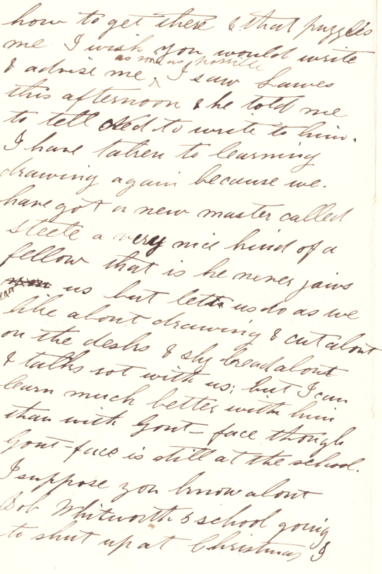 I have taken to learning drawing again because we have got a new master called Steele a very nice kind of fellow that is he never joins us buts lets us do as we like about drawing and cutabout on the desks and ??? and talks rot with us; but I can learn much better with him than Gout-face, though Gout-face is still at the school.