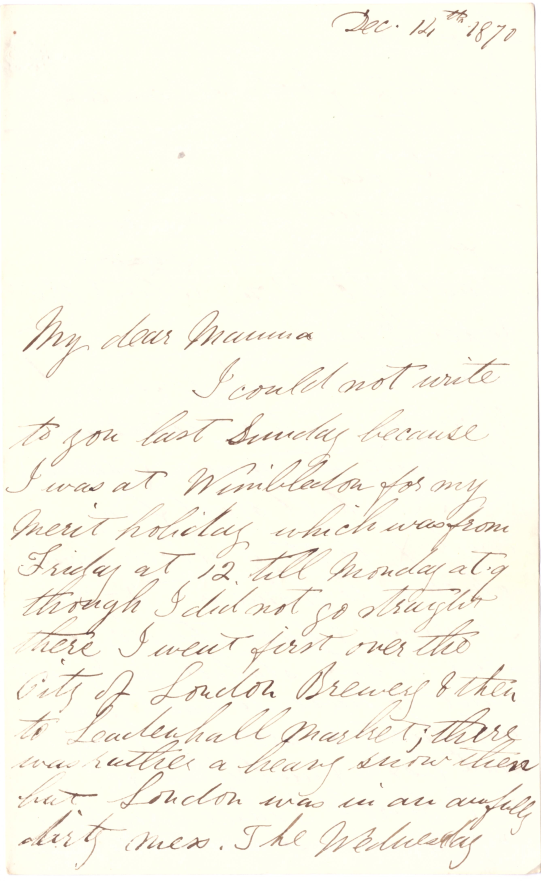 I could not write to you last Sunday becasue I was at Wimbledon for my merit holiday which was from Friday at 12 till Monday at 9, thought I did not go straight there over the City of London Brewery and then Leadenhall Market; there was rather a heavy storm there but London was in an awfully dirty mess.