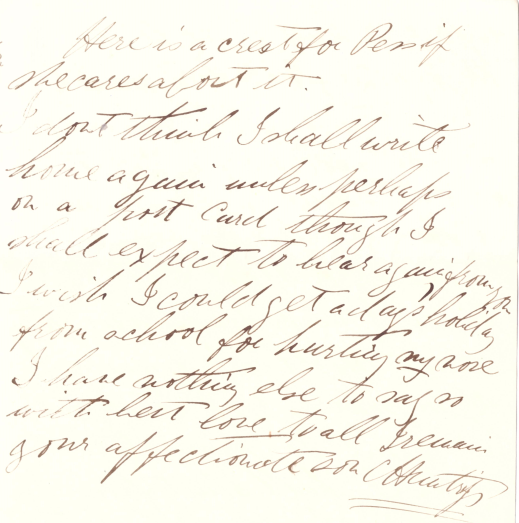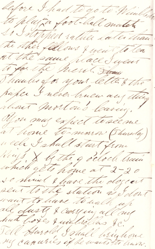 You may expect to see me at home tomorrow (Thursday) week. I shall start from Kings Cross by the 8 o'clock train which gets to home at 2-20 so mind and have the dog-cart sent to the station as I dont want to have walk back all dusty and carrying all my hat boxes and umbrellas etc.