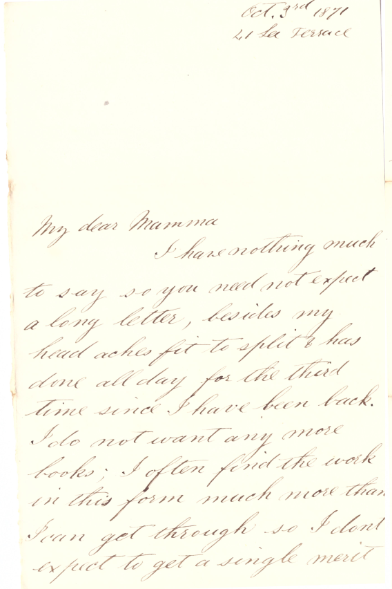 I have nothing much to say so you should not exect a long letter, besides my head aches fit to split and has done all day for the third time since Ihave been back.