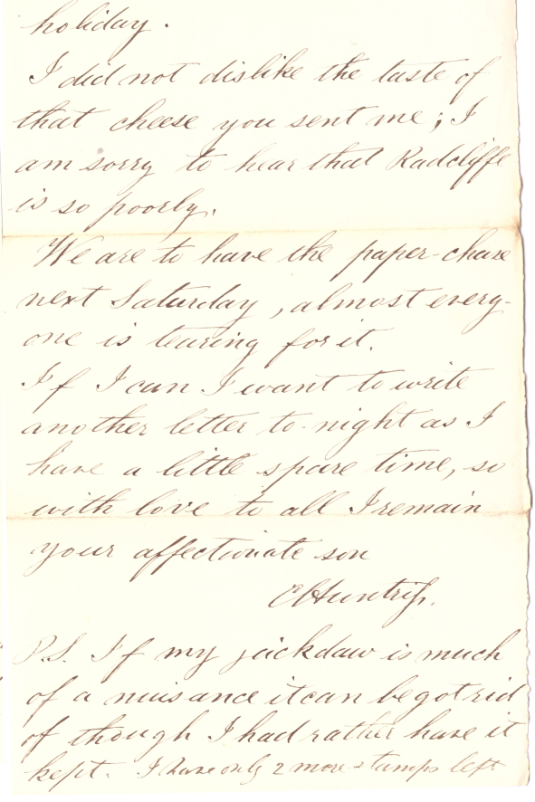 we are to have the paper chase next Saturday - almost everyone is taking part. If I can, I want to write another letter tonight as I have a little spare time, so with much love to all, I remain your affectionate son.