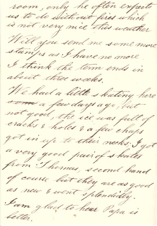We had a little skating here a few days ago, but not good; the ice was full of cracks and holes and a few chaps got in up to their necks. I got a very good pair of skates from Thomas - second hand of course- but they are as good as new and went splendidly.