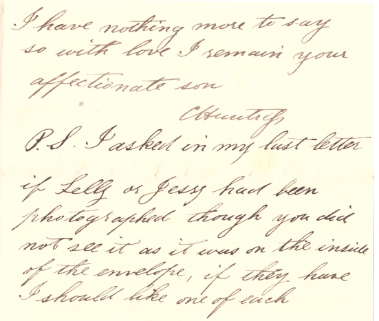 PS I asked in my last letter if Lelly or Jessy had been photographed though you did not see it as it was written on the envelope, if they have I should like one of each.