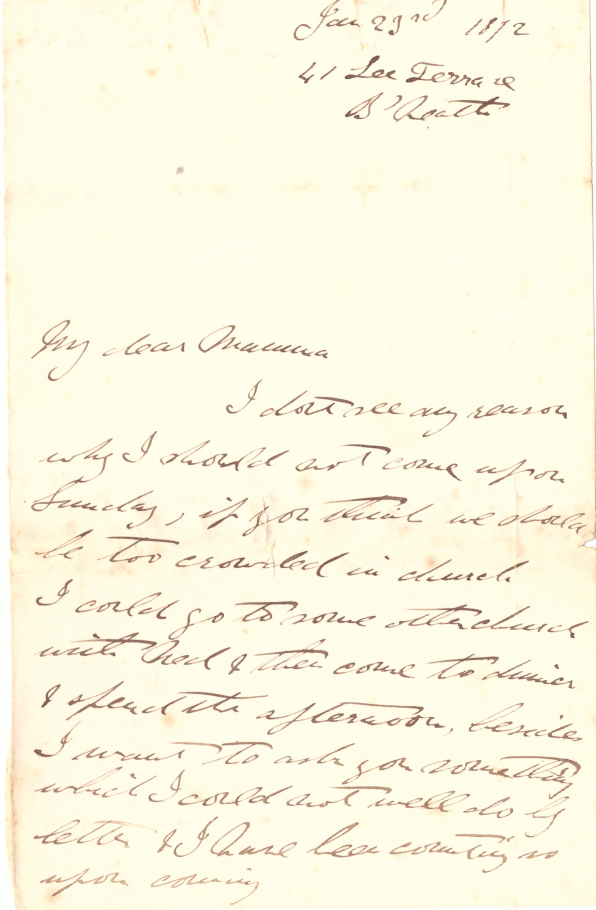I don't see any reason why I should not come up on Sunday, if you think we should be too crowded in church I could go to some other church with Ned and then come to dinner and spend the afternoon, beside I want to ask you something which I could not well do by letter and I have been counting so on leaving.
