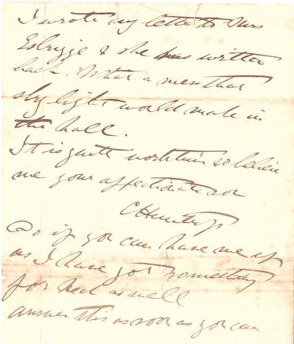 I wrote my letter to Mrs Eskrigge and she has written . What a mess that skylight would make in the hall.