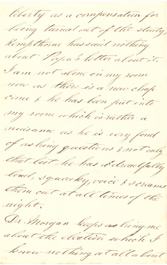 ... liberty as a compensation for being turned out of the study, Kempthorpe has said nothing about Papa's letter about it. I am not alone in my room now as there is a new chap come and he has been put into my room which is rather a nuisance as he is rather fond of asking questions and not only that he has a dreadfully loud, squeeky voice and screams them out at all times of the night.