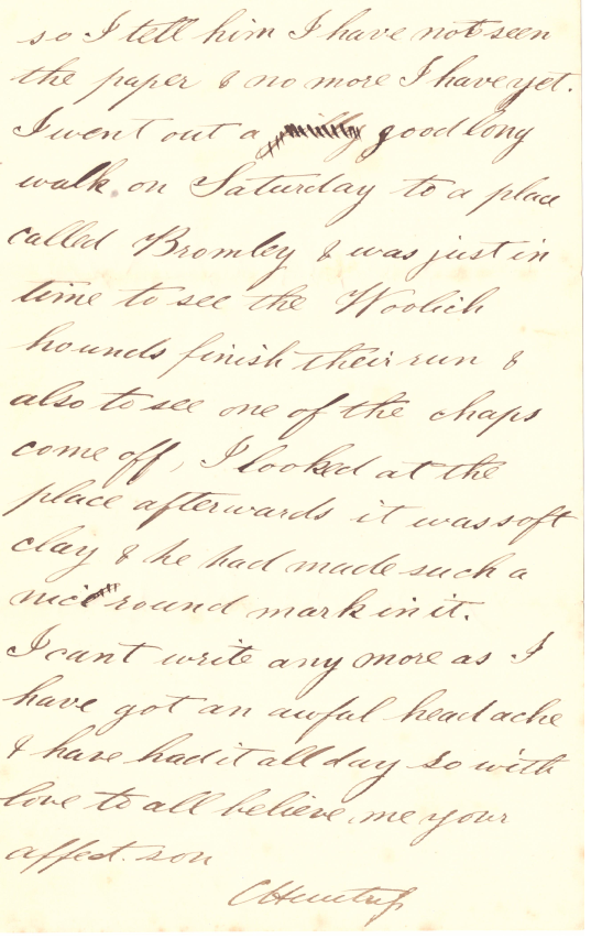 I went out a good long walk on Saturday to a place called Bromley and it was just in time to see the Woolwich hounds finish their run and seeone of the chaps come off. I looked at the place afterwards it was soft clay and he made such a nice round mark in it.
