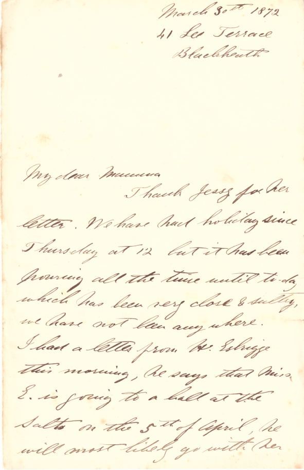 I had a letter from Mr Eskrigge this morning, he says that Miss E is going to a ball at the Salts on the 5th April, he will most likely go with her ...