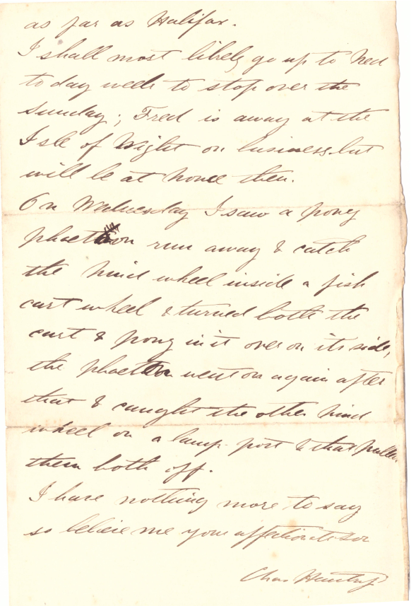 On Wednesday I saw a pony phaeton run away and catch the hind wheel inside a fish cart wheel and turned both the cart and pony in it over on its side. The phaeton went on again after that and caught the other hind wheel on a lamp post and that pulled both off.