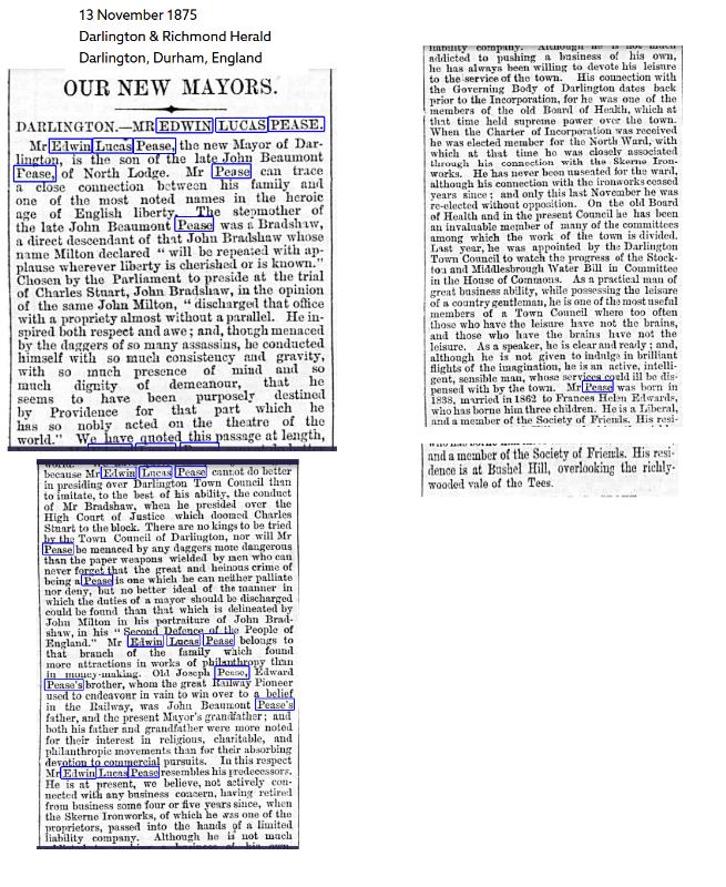 "John Beaumont Pease the cousin of Joseph Pease bought Bushell Hill as a country retreat and in 1862 Mowden Hall was built. When he died in 1873 he left his fortune to his son Edwin Lucas who became the Squire of Bushell Hill and in 1881 Mowden Hall was extended. However in 1889 Edwin Lucas Pease died after falling during a fox hunt and the Estate was left to William Edwin Pease. He was a successful businessman and became MP for Darlington in 1923 but never married and died in 1926." Ian Henderson - "Darlington as it Looked" on facebook.