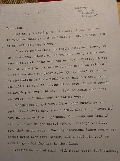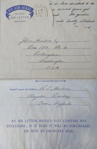 John maintained contact with the family in the UK. In this air mail letter, written in 1956, Charles described the work that was being done on the house that he had recently purchased.