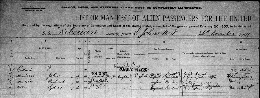 After the war, John made a number of voyages to and from Newfoundland. At some point he had met Kitty Pooke when she was staying at the shooting and fishing lodge owned by her father. My understanding is that the match did not meet with the approval of John's father, who felt that John was marrying beneath himself. Charles, his father, died in April 1907; later that year John sailed back to England with his brother Richard.