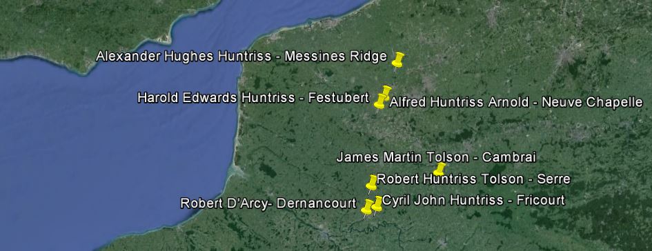 At least nine members of the extended Huntriss family were killed in the first World War. For those who fell in Europe, the map below shows where they died or received fatal injuries (except for Pte William Huntriss - I have not yet come across the location of his final battle).