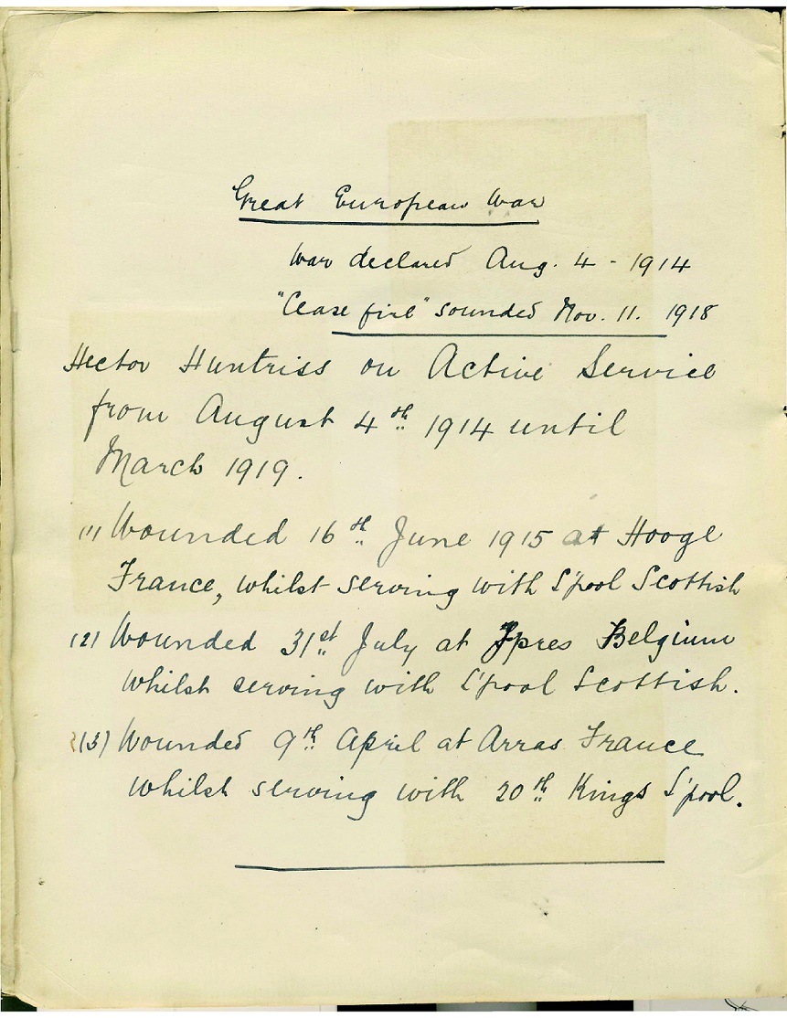 The newspaper cuttings on these pages are taken from a scrapbook kept by the parents of Hector Huntriss, containing descriptions of the activities of the King's Liverpool Regiment during the first World War.