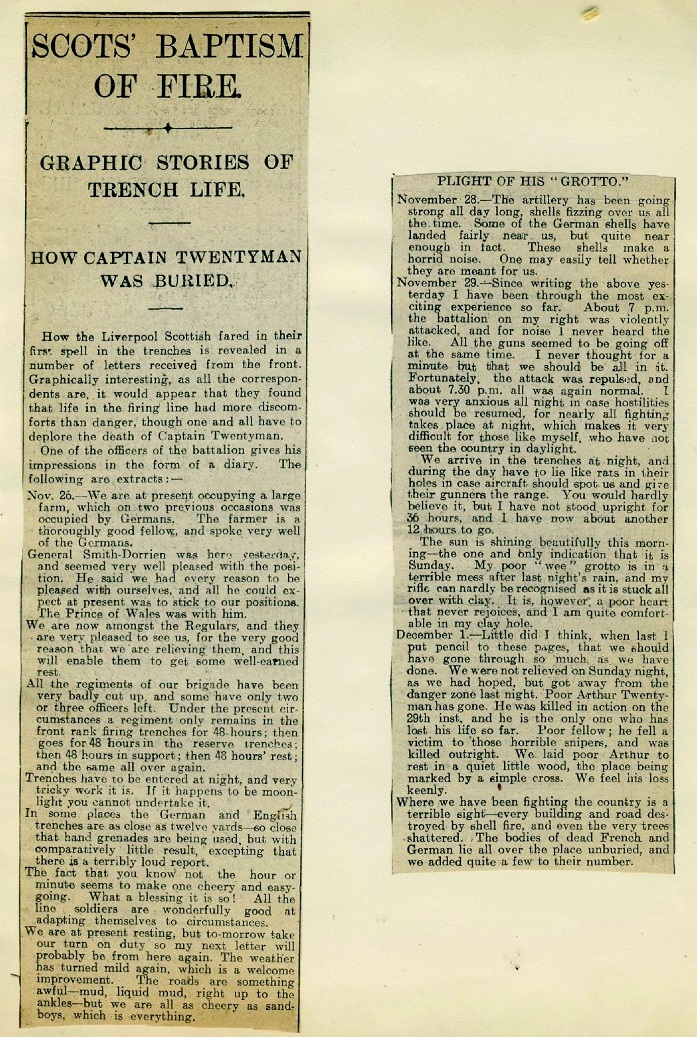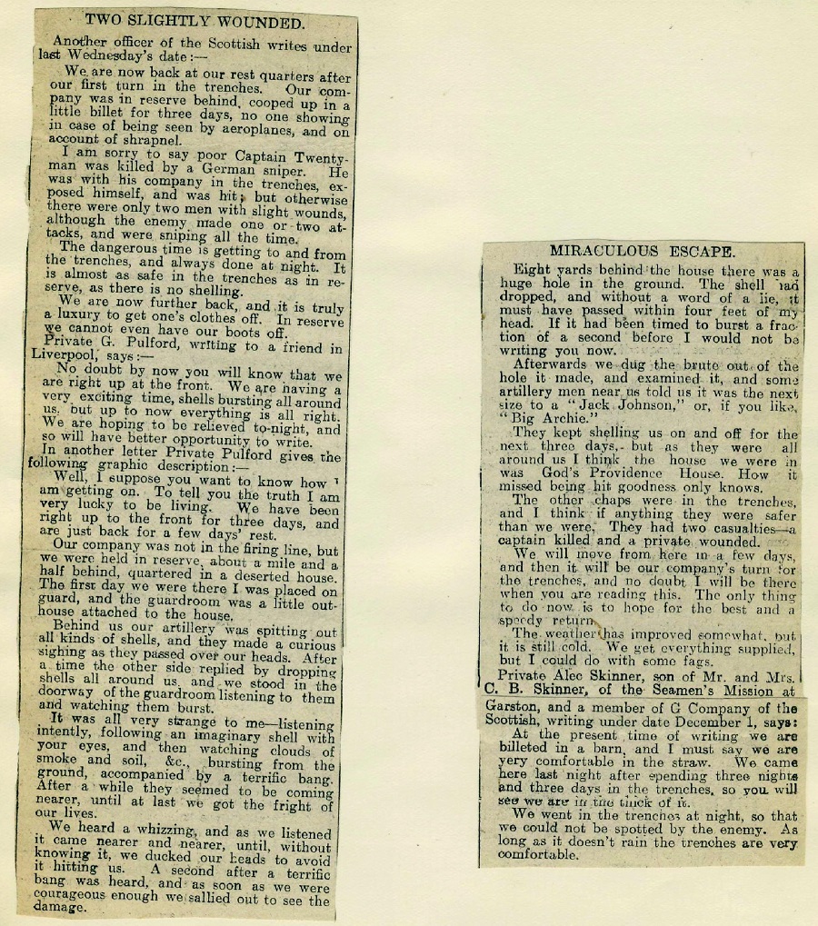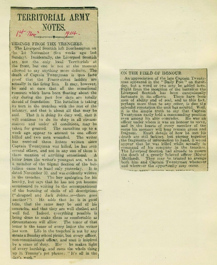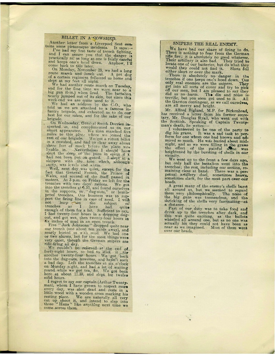 The newspaper cuttings on these pages are taken from a scrapbook kept by the parents of Hector Huntriss, containing descriptions of the activities of the King's Liverpool Regiment during the first World War.