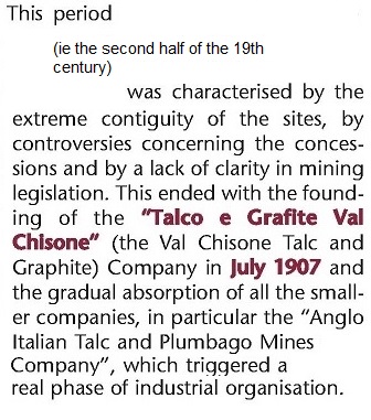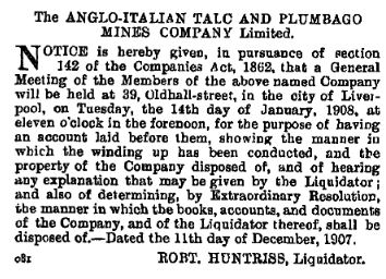 In 1907,the Anglo Italian Talc and Plumbago Mines Company Ltd was wound up ......